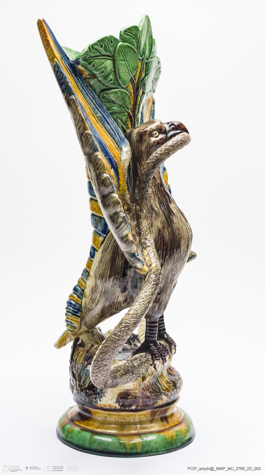Matéria/Técnica: Barro branco moldado e modelado. Vidrado polícromo; castanho, cinzento, azul, verde e amarelo; Cronologia: 1887-1890; Autoria: Eduardo Augusto Mafra / Fábrica de Manuel Cipriano Gomes O Mafra, Caldas da Rainha, Portugal; Dimensões (cm): Altura: 27,5; Largura: 13,3; Comprimento: 21,8.