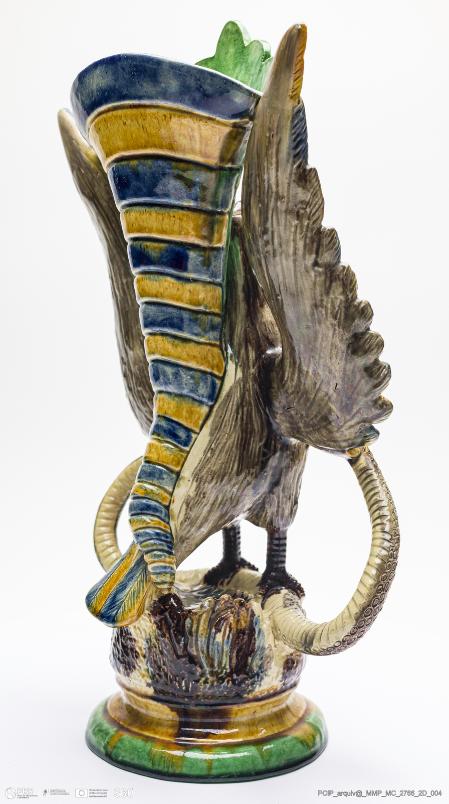 Matéria/Técnica: Barro branco moldado e modelado. Vidrado polícromo; castanho, cinzento, azul, verde e amarelo; Cronologia: 1887-1890; Autoria: Eduardo Augusto Mafra / Fábrica de Manuel Cipriano Gomes O Mafra, Caldas da Rainha, Portugal; Dimensões (cm): Altura: 27,5; Largura: 13,3; Comprimento: 21,8.