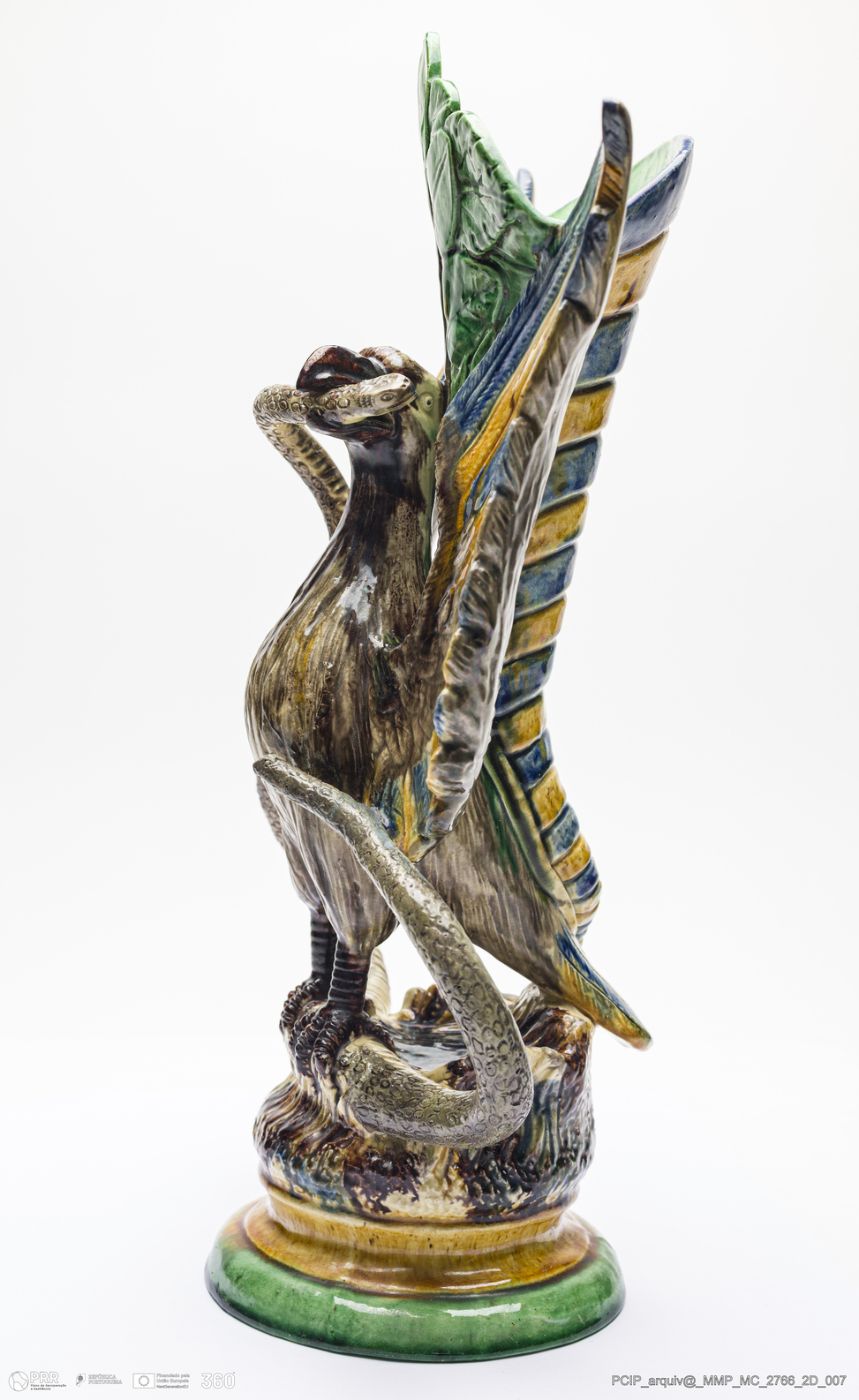 Matéria/Técnica: Barro branco moldado e modelado. Vidrado polícromo; castanho, cinzento, azul, verde e amarelo; Cronologia: 1887-1890; Autoria: Eduardo Augusto Mafra / Fábrica de Manuel Cipriano Gomes O Mafra, Caldas da Rainha, Portugal; Dimensões (cm): Altura: 27,5; Largura: 13,3; Comprimento: 21,8.