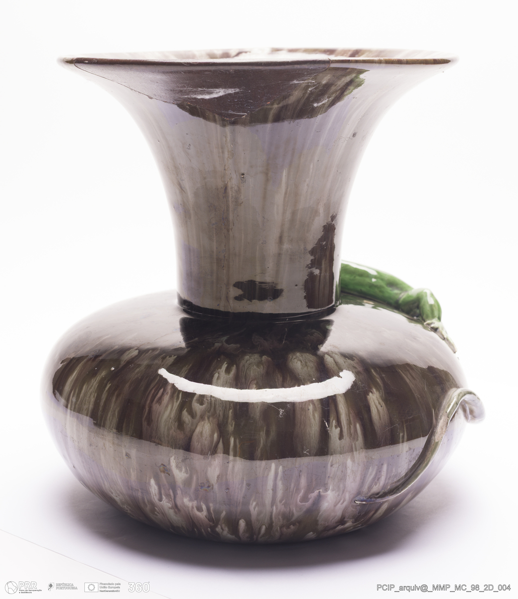 Matéria/Técnica: Barro vermelho rodado e modelado. Vidrado polícromo: castanho, verde e branco. Escorridos; Cronologia: 1899; Autoria: Rafael Bordalo Pinheiro / Fábrica de Faianças Bordalo Pinheiro, Caldas da Rainha, Portugal; Dimensões (cm): Altura: 24; Diâmetro: 25.