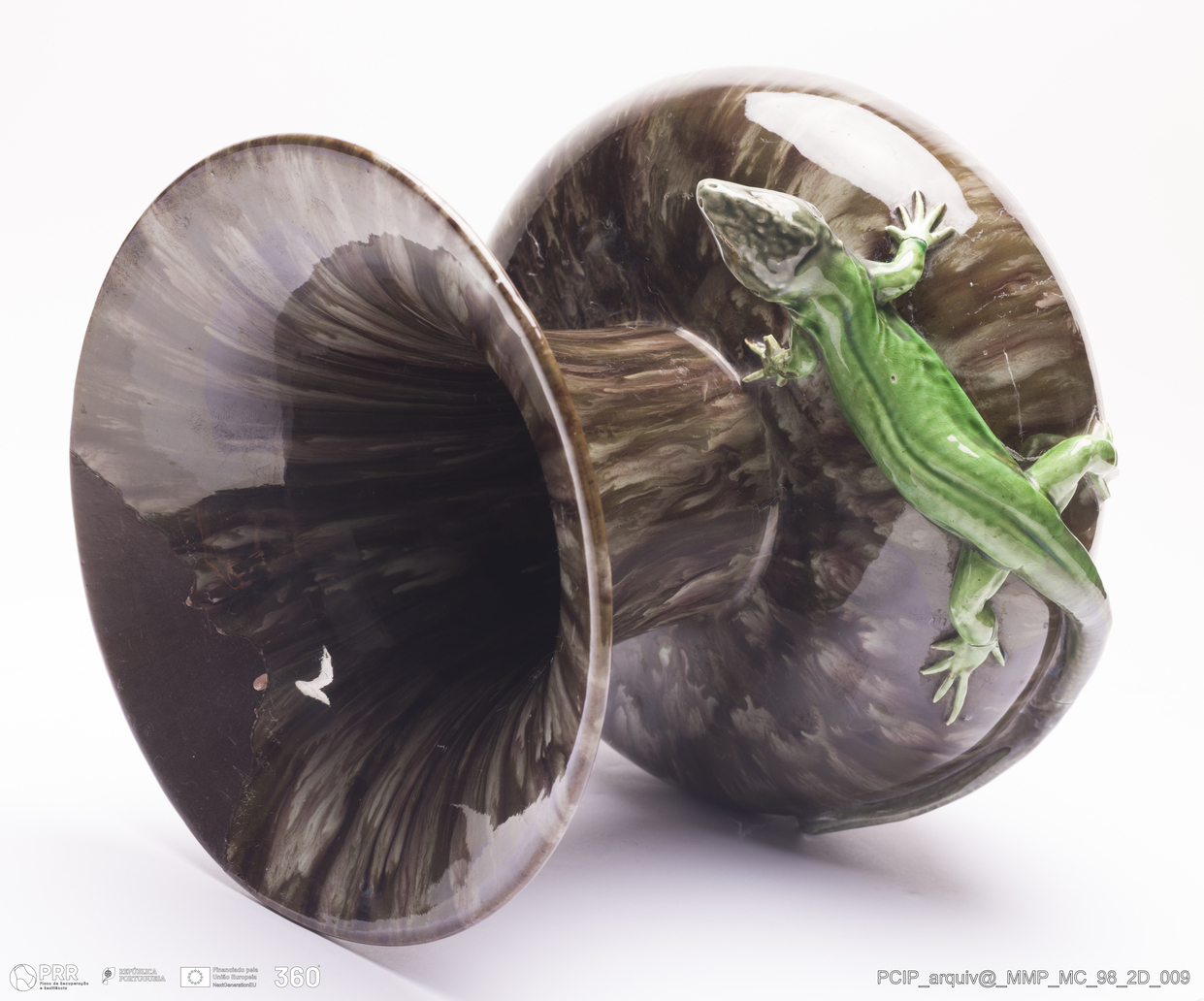Matéria/Técnica: Barro vermelho rodado e modelado. Vidrado polícromo: castanho, verde e branco. Escorridos; Cronologia: 1899; Autoria: Rafael Bordalo Pinheiro / Fábrica de Faianças Bordalo Pinheiro, Caldas da Rainha, Portugal; Dimensões (cm): Altura: 24; Diâmetro: 25.