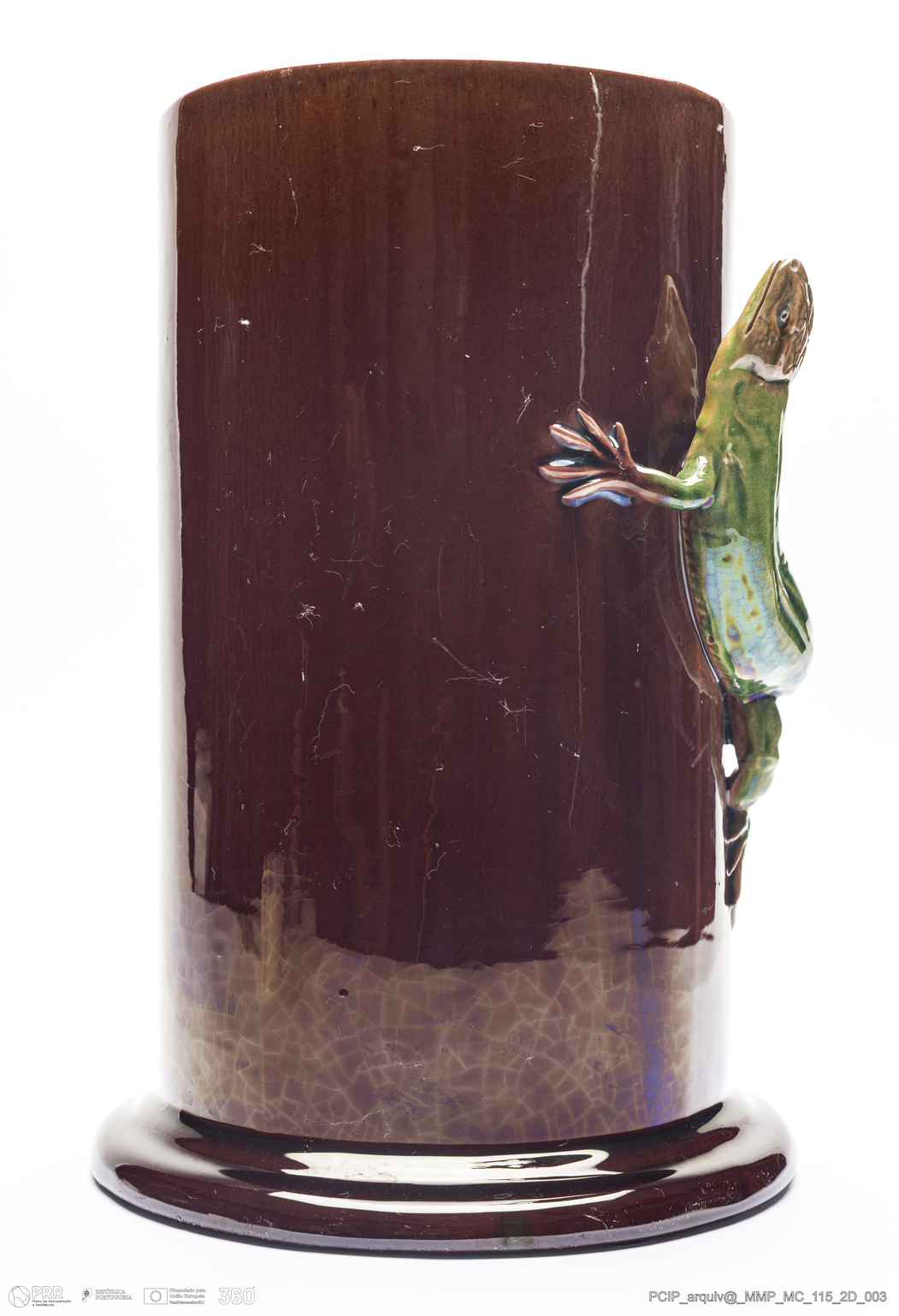 Matéria/Técnica: Barro vermelho rodado e moldado. Vidrado polícromo: castanho e verde; Cronologia: 1901; Autoria: Rafael Bordalo Pinheiro / Fábrica De Faianças Bordalo Pinheiro, Caldas da Rainha, Portugal; Dimensões (cm): Altura: 24; Diâmetro: 18.