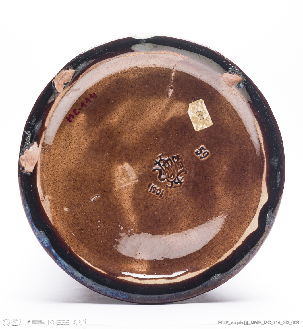 Matéria/Técnica: Barro vermelho rodado e moldado. Vidrado polícromo: castanho e verde; Cronologia: 1901; Autoria: Rafael Bordalo Pinheiro / Fábrica De Faianças Bordalo Pinheiro, Caldas da Rainha, Portugal; Dimensões (cm): Altura: 24; Diâmetro: 18.
