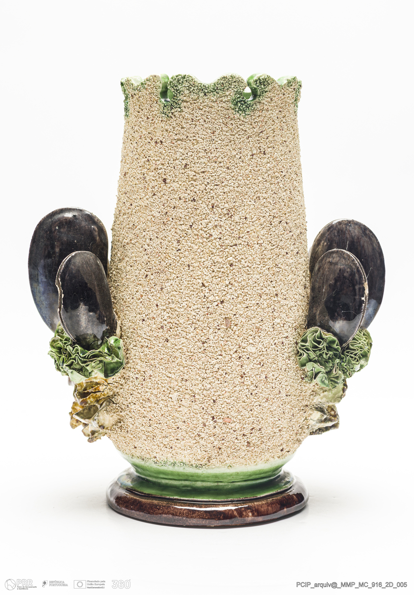 Matéria/Técnica: Barro branco moldado e modelado. Vidrado polícromo: castanho escuro, mel e verde. Pintura a frio: verde água, azul claro e branco; Cronologia: 1860-1893; Autoria: José Francisco de Sousa / Fábrica de José Francisco de Sousa, Caldas da Rainha, Portugal; Dimensões (cm): Altura: 21,8; Largura: 19,1.