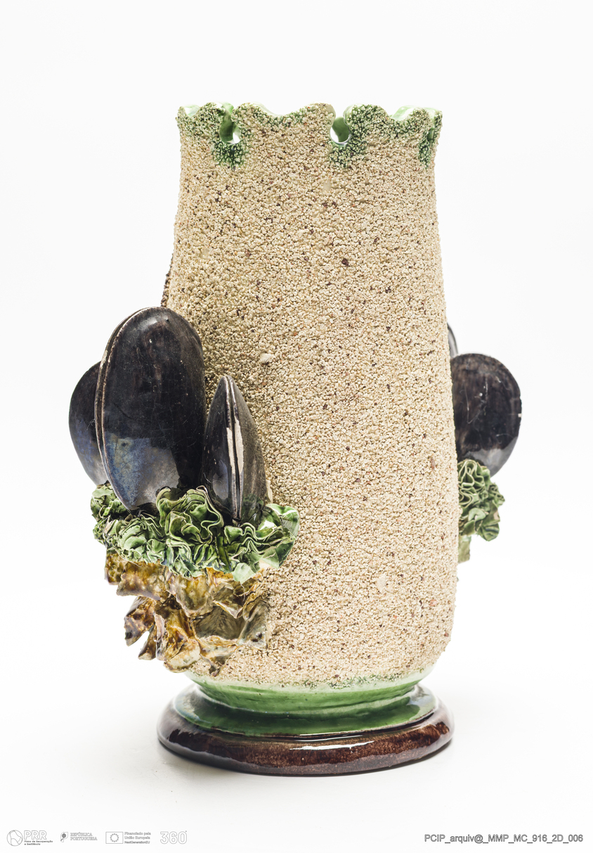 Matéria/Técnica: Barro branco moldado e modelado. Vidrado polícromo: castanho escuro, mel e verde. Pintura a frio: verde água, azul claro e branco; Cronologia: 1860-1893; Autoria: José Francisco de Sousa / Fábrica de José Francisco de Sousa, Caldas da Rainha, Portugal; Dimensões (cm): Altura: 21,8; Largura: 19,1.