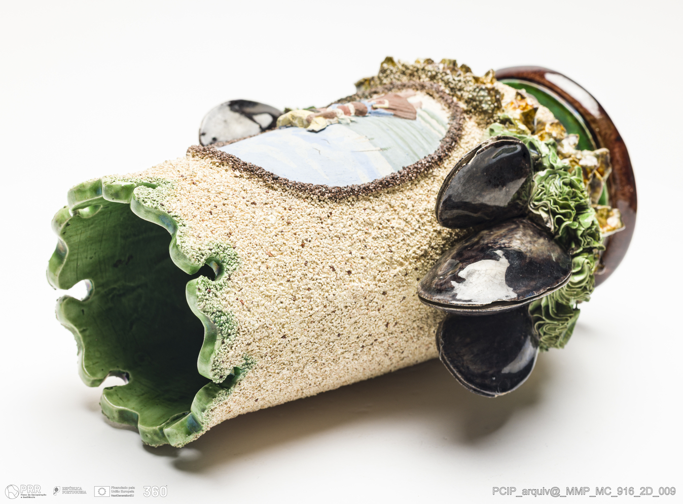 Matéria/Técnica: Barro branco moldado e modelado. Vidrado polícromo: castanho escuro, mel e verde. Pintura a frio: verde água, azul claro e branco; Cronologia: 1860-1893; Autoria: José Francisco de Sousa / Fábrica de José Francisco de Sousa, Caldas da Rainha, Portugal; Dimensões (cm): Altura: 21,8; Largura: 19,1.