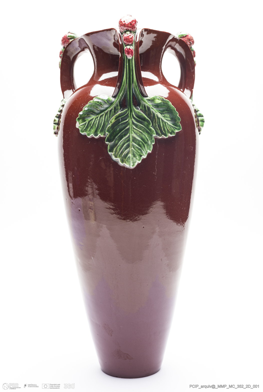 Matéria/Técnica: Barro branco rodado e moldado. Vidrado polícromo: verde de cobre com corante avermelhado; Cronologia: 1911; Autoria: António Augusto da Costa Motta / Fábrica de Faianças das Caldas da Rainha, Portugal; Dimensões (cm): Desconhecidas.