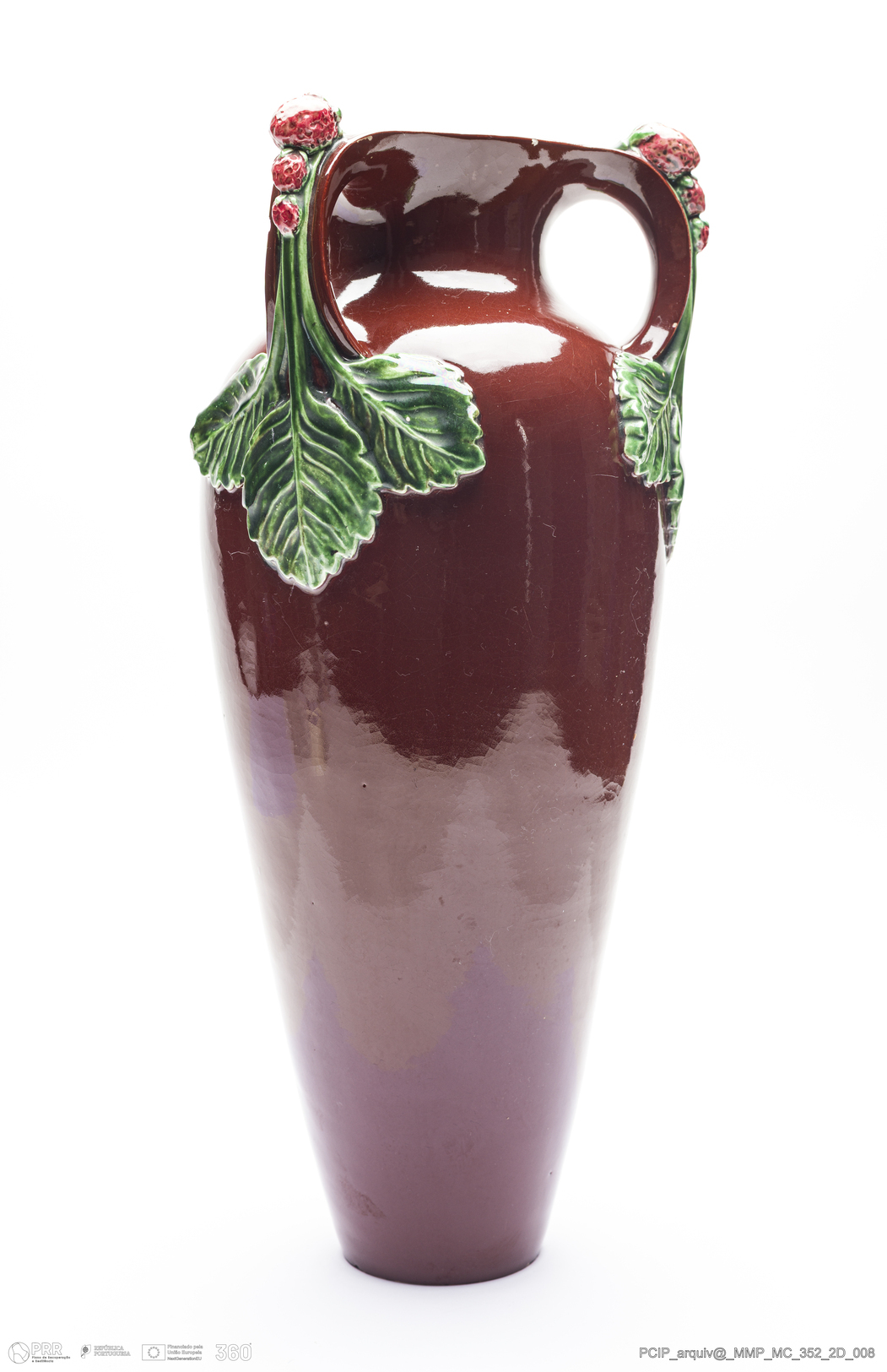 Matéria/Técnica: Barro branco rodado e moldado. Vidrado polícromo: verde de cobre com corante avermelhado; Cronologia: 1911; Autoria: António Augusto da Costa Motta / Fábrica de Faianças das Caldas da Rainha, Portugal; Dimensões (cm): Desconhecidas.