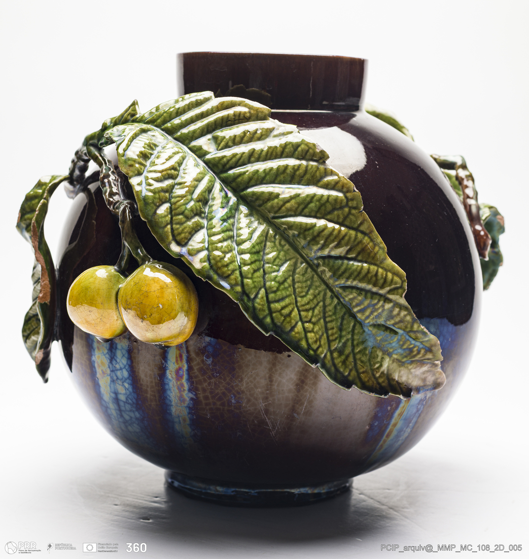 Matéria/Técnica: Barro vermelho moldado e modelado. Vidrado polícromo: castanho, verde e amarelo; Cronologia: 1903; Autoria: Rafael Bordalo Pinheiro / Fábrica De Faianças Bordalo Pinheiro, Caldas da Rainha, Portugal; Dimensões (cm): Altura: 28; Diâmetro: 30.