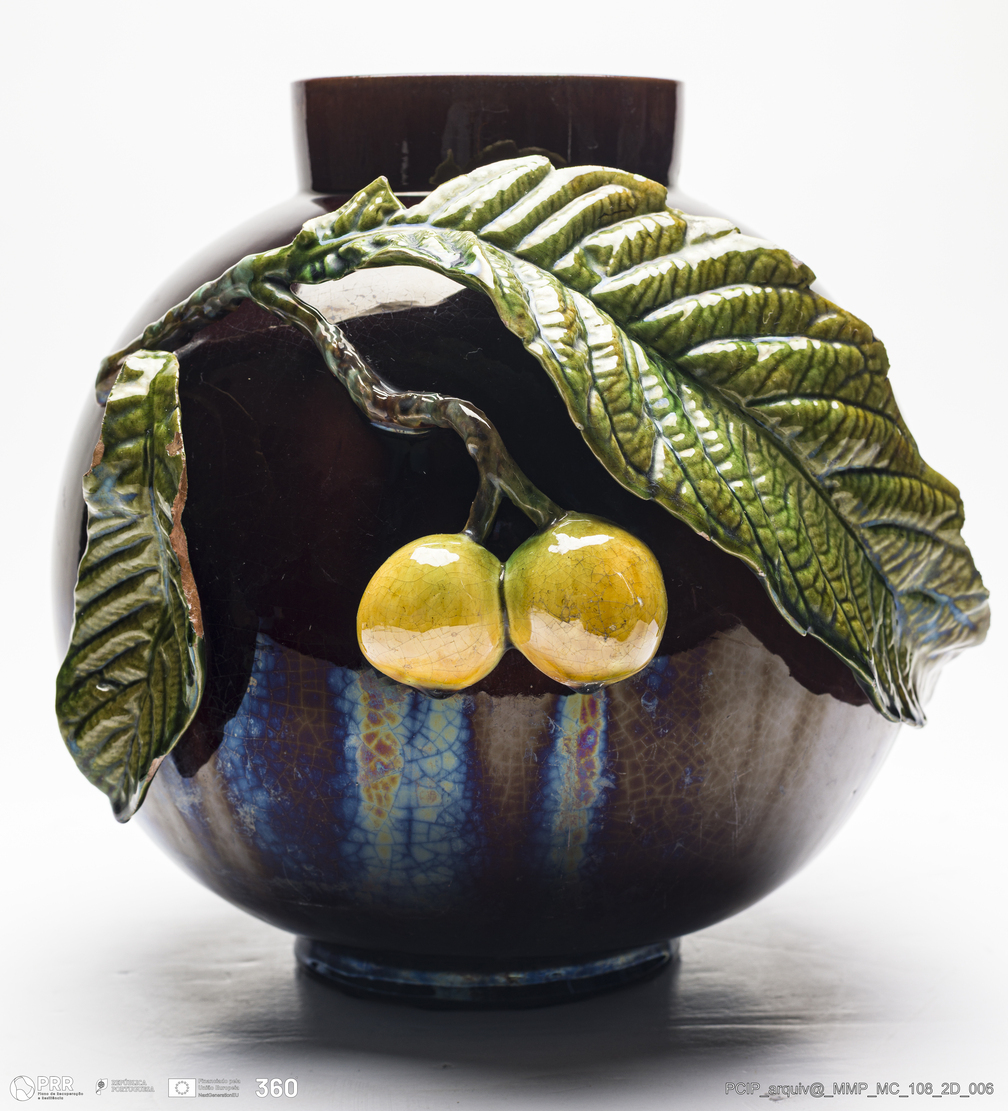 Matéria/Técnica: Barro vermelho moldado e modelado. Vidrado polícromo: castanho, verde e amarelo; Cronologia: 1903; Autoria: Rafael Bordalo Pinheiro / Fábrica De Faianças Bordalo Pinheiro, Caldas da Rainha, Portugal; Dimensões (cm): Altura: 28; Diâmetro: 30.