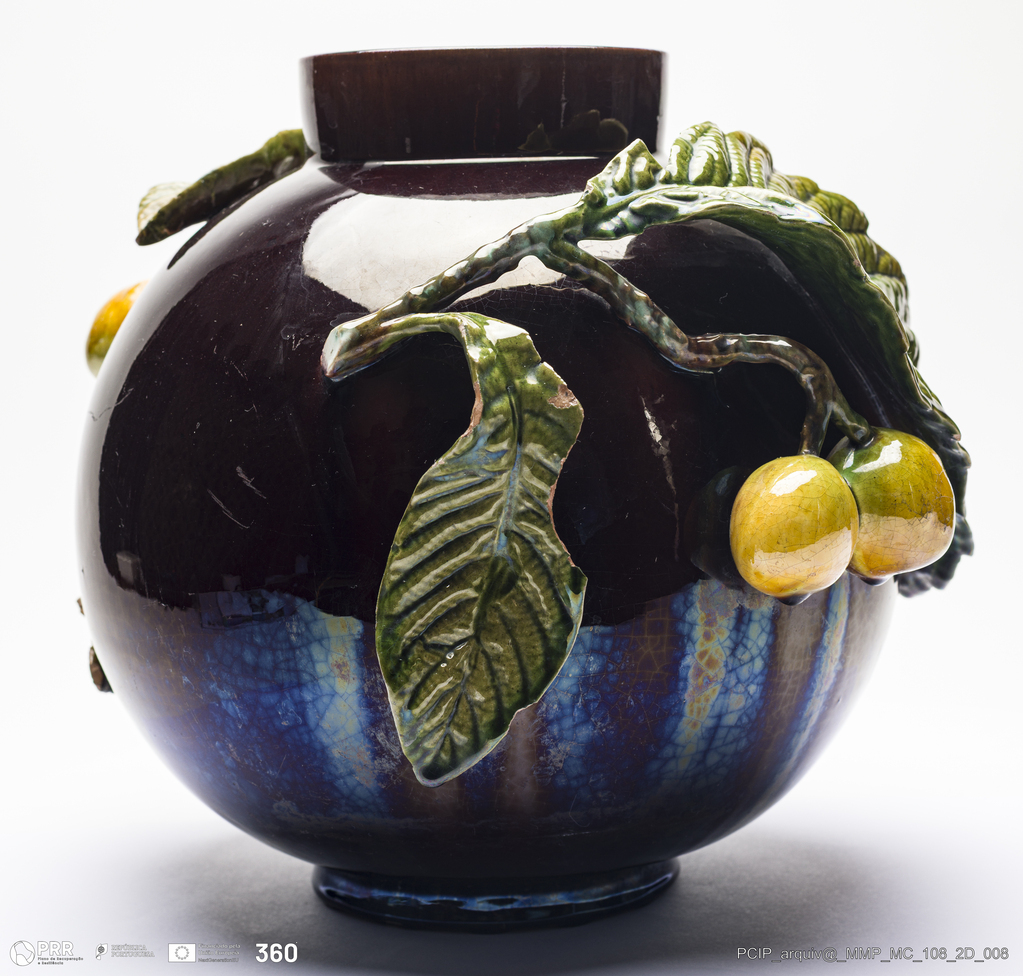 Matéria/Técnica: Barro vermelho moldado e modelado. Vidrado polícromo: castanho, verde e amarelo; Cronologia: 1903; Autoria: Rafael Bordalo Pinheiro / Fábrica De Faianças Bordalo Pinheiro, Caldas da Rainha, Portugal; Dimensões (cm): Altura: 28; Diâmetro: 30.