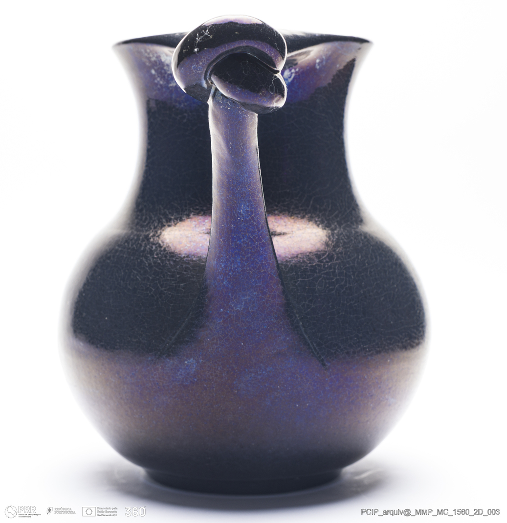 Matéria/Técnica: Barro vermelho moldado. Vidrado monocromo azul cobalto metalizado; Cronologia: 1912; Autoria: António Augusto da Costa Motta / Fábrica de Faianças das Caldas da Rainha, Portugal; Dimensões (cm): Altura: 22; Largura: 32; Comprimento: 19.