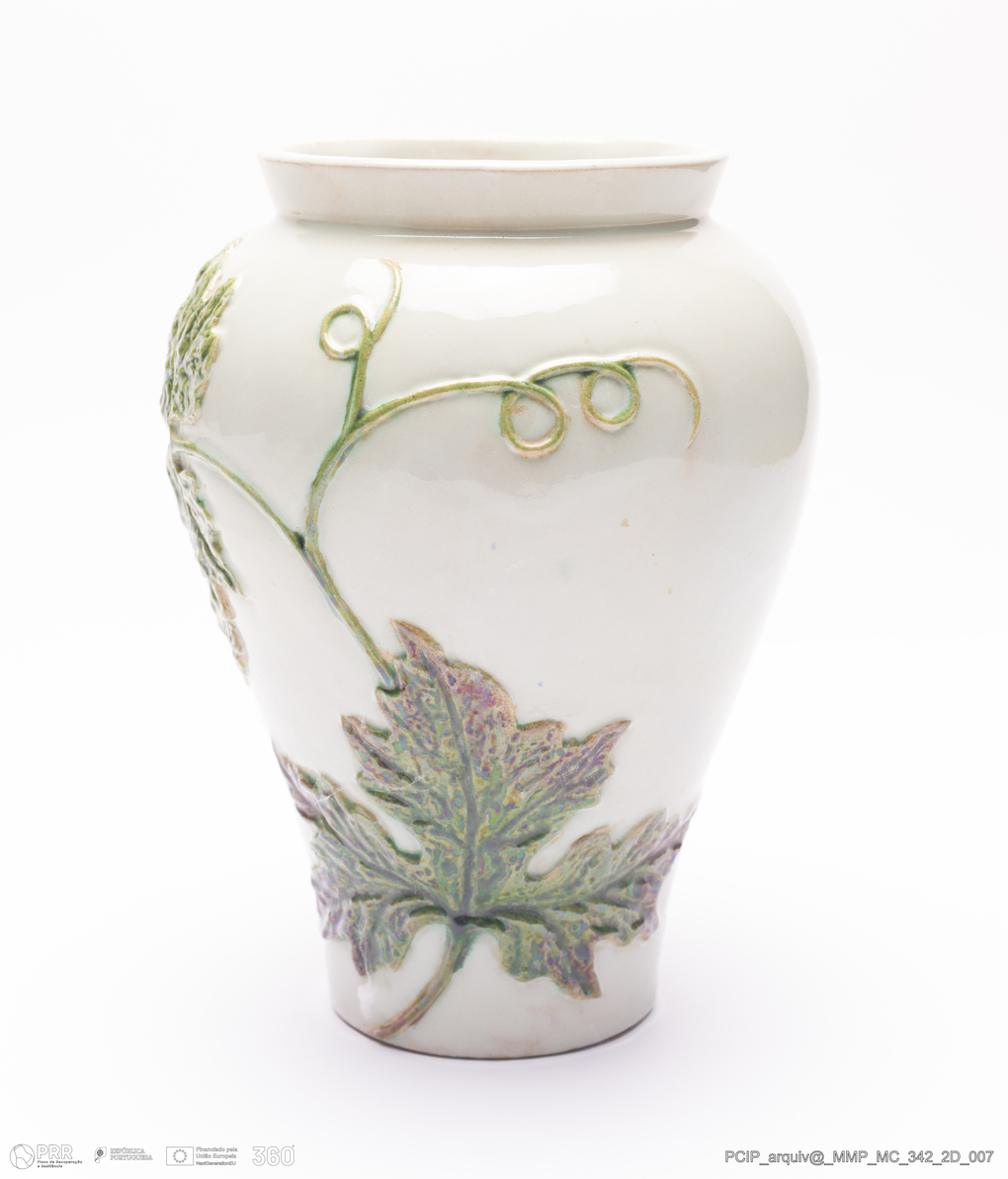 Matéria/Técnica: Barro vermelho moldado. Vidrado polícromo: verde e branco; Cronologia: 1906; Autoria: Manual Gustavo Bordalo Pinheiro e José Carlos dos Santos / Fábrica de Faianças das Caldas da Rainha, Portugal; Dimensões (cm): Altura: 18,5; Diâmetro: 16.