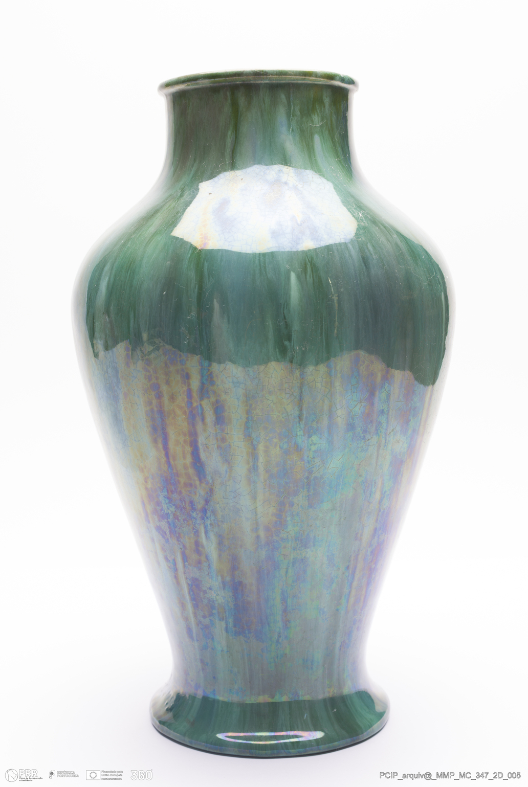 Matéria/Técnica: Barro vermelho rodado e moldado. Vidrado polícromo: verde, azul, branco e vermelho escuro; Cronologia: 1908; Autoria: Manual Gustavo Bordalo Pinheiro / Fábrica de Faianças das Caldas da Rainha, Portugal; Dimensões (cm): Altura: 27,5; Diâmetro: 19.