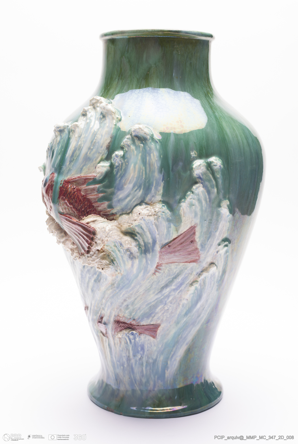 Matéria/Técnica: Barro vermelho rodado e moldado. Vidrado polícromo: verde, azul, branco e vermelho escuro; Cronologia: 1908; Autoria: Manual Gustavo Bordalo Pinheiro / Fábrica de Faianças das Caldas da Rainha, Portugal; Dimensões (cm): Altura: 27,5; Diâmetro: 19.