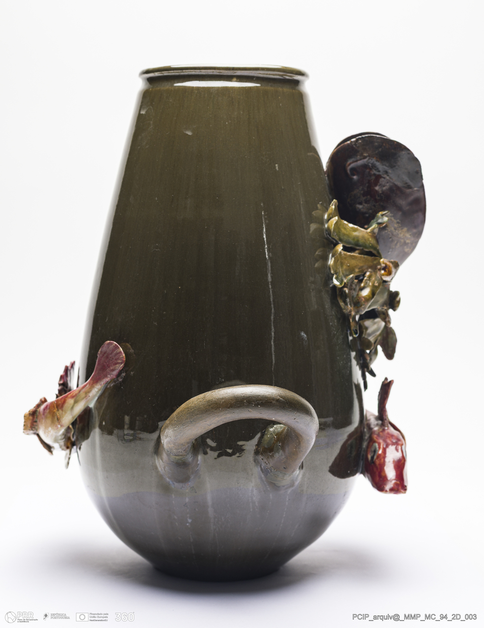 Matéria/Técnica: Barro vermelho rodado e moldado. Vidrado polícromo: castanho, verde, vermelho e branco; Cronologia: 1898; Autoria: Rafael Bordalo Pinheiro / Fábrica de Faianças Bordalo Pinheiro, Caldas da Rainha, Portugal; Dimensões (cm): Altura: 30; Largura: 30; Comprimento: 30.