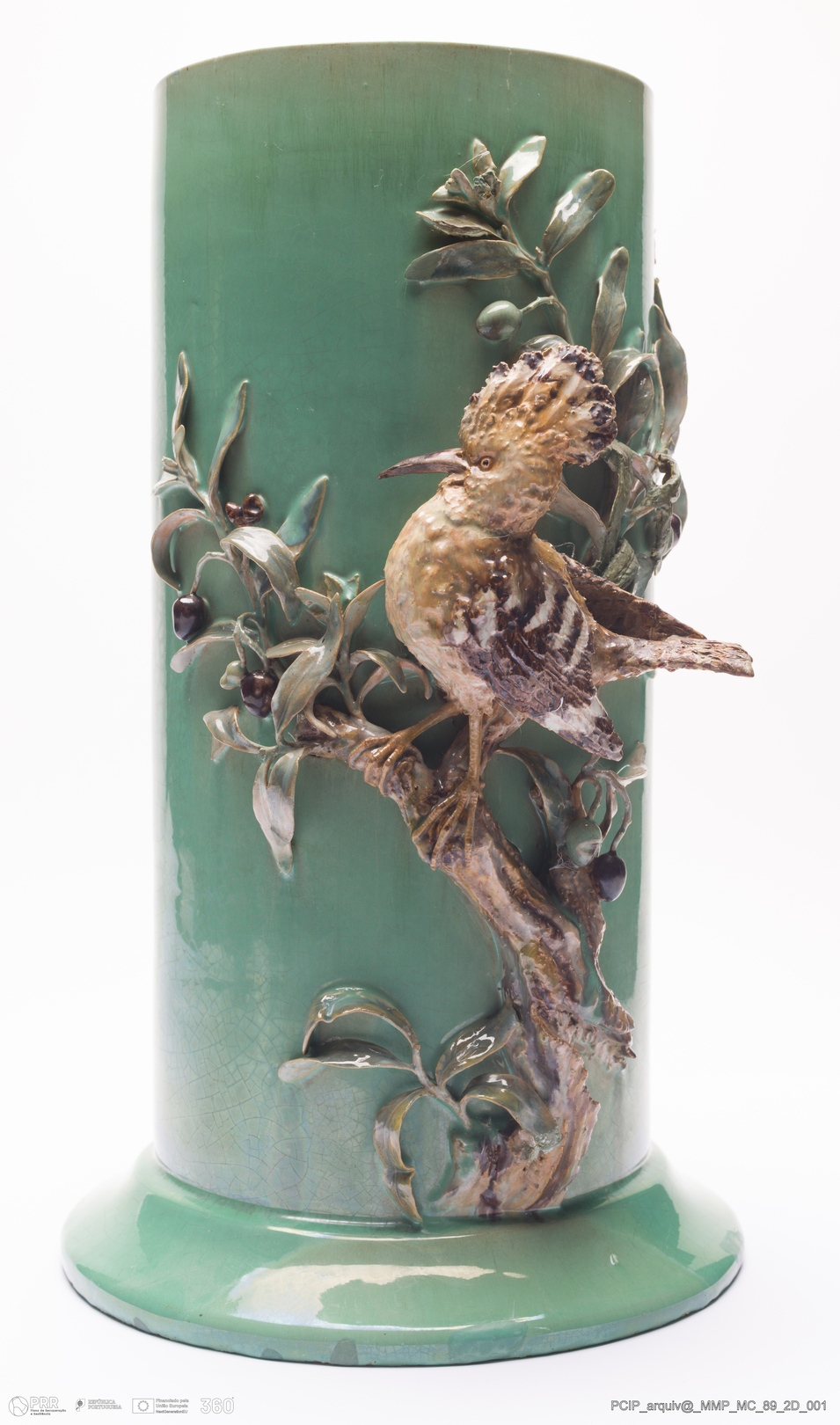Matéria/Técnica: Barro branco moldado e modelado. Vidrado polícromo: preto, castanho escuro e mel, verde; Cronologia: 1900; Autoria: Rafael Bordalo Pinheiro / Fábrica de Faianças Bordalo Pinheiro, Caldas da Rainha, Portugal; Dimensões (cm): Altura: 41; Diâmetro: 25.