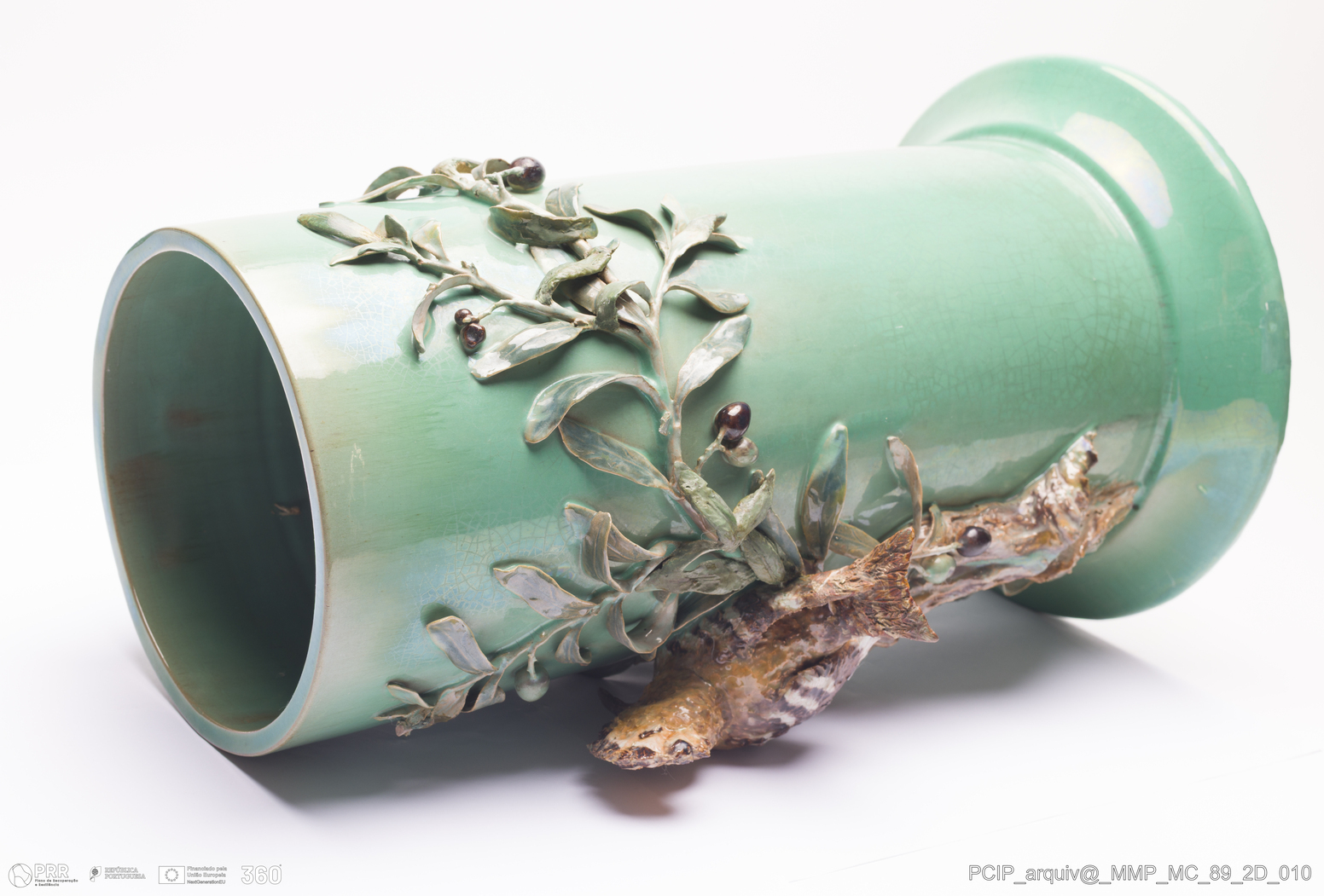 Matéria/Técnica: Barro branco moldado e modelado. Vidrado polícromo: preto, castanho escuro e mel, verde; Cronologia: 1900; Autoria: Rafael Bordalo Pinheiro / Fábrica de Faianças Bordalo Pinheiro, Caldas da Rainha, Portugal; Dimensões (cm): Altura: 41; Diâmetro: 25.