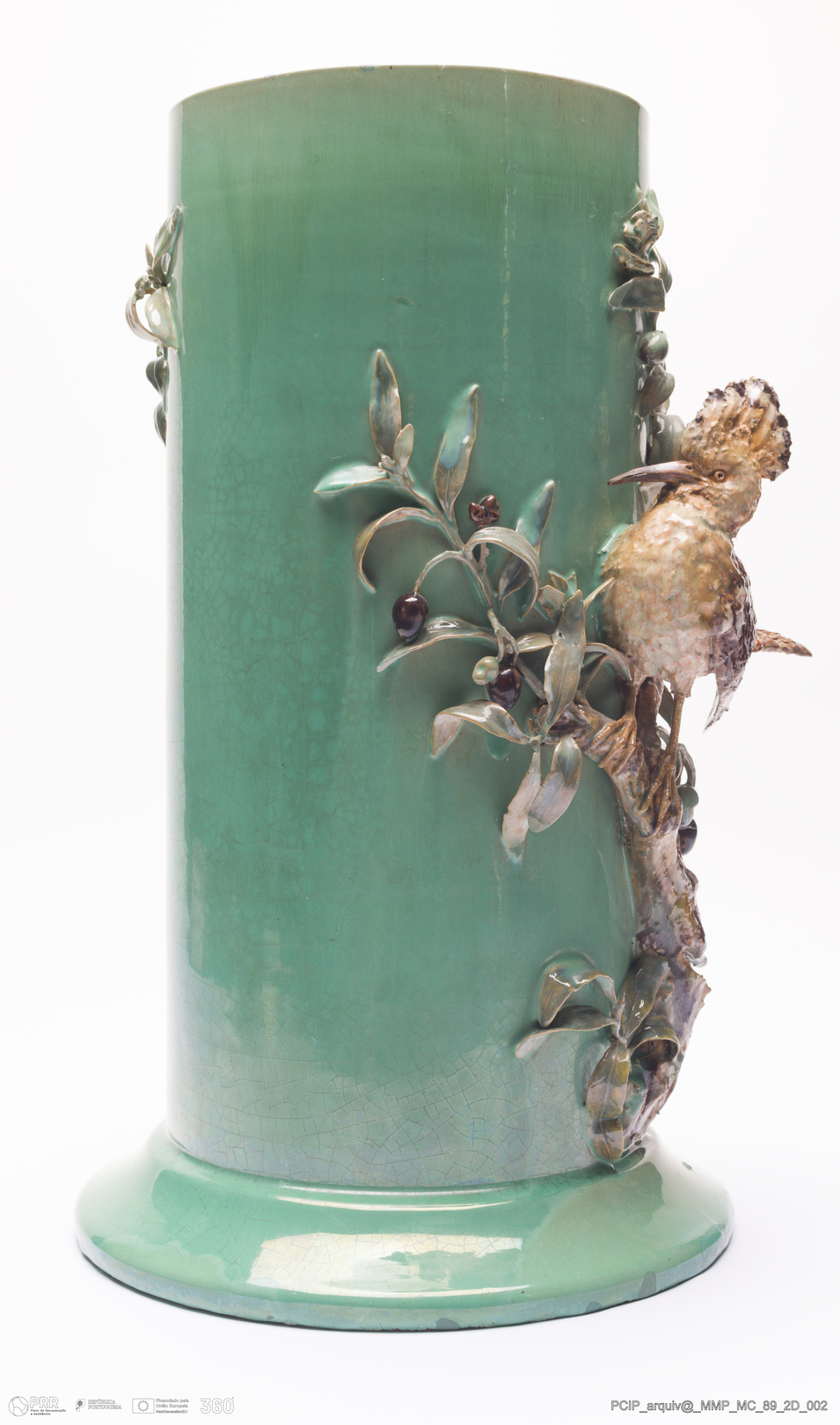 Matéria/Técnica: Barro branco moldado e modelado. Vidrado polícromo: preto, castanho escuro e mel, verde; Cronologia: 1900; Autoria: Rafael Bordalo Pinheiro / Fábrica de Faianças Bordalo Pinheiro, Caldas da Rainha, Portugal; Dimensões (cm): Altura: 41; Diâmetro: 25.