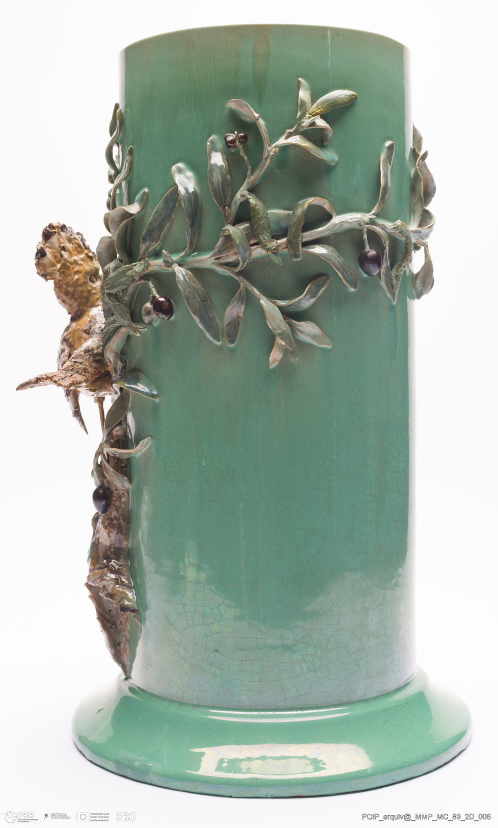 Matéria/Técnica: Barro branco moldado e modelado. Vidrado polícromo: preto, castanho escuro e mel, verde; Cronologia: 1900; Autoria: Rafael Bordalo Pinheiro / Fábrica de Faianças Bordalo Pinheiro, Caldas da Rainha, Portugal; Dimensões (cm): Altura: 41; Diâmetro: 25.