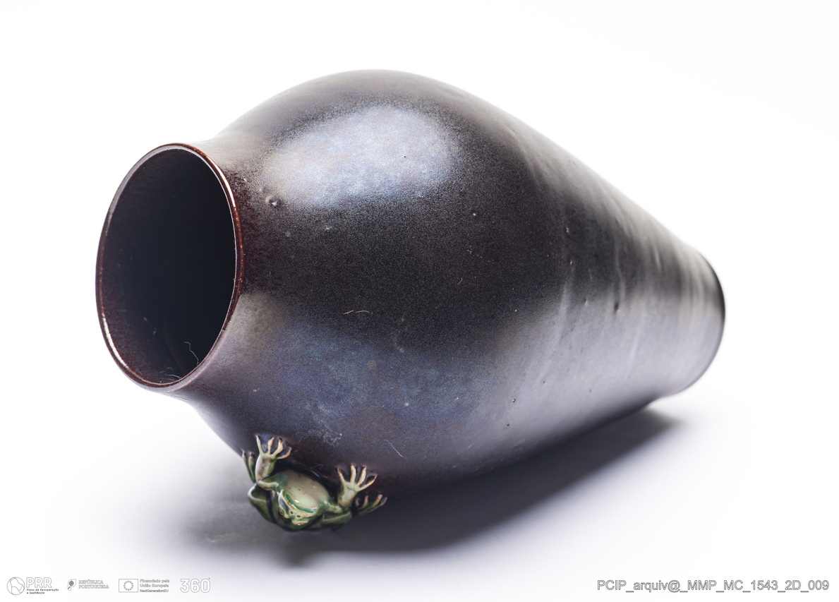 Matéria/Técnica: Barro rodado e moldado. Vidrado polícromo: castanho escuro mate e verde; Cronologia: 1908; Autoria: Manuel Gustavo Bordalo Pinheiro / Fábrica Bordalo Pinheiro, Caldas da Rainha, Portugal; Dimensões (cm): Altura: 16; Diâmetro: 13.