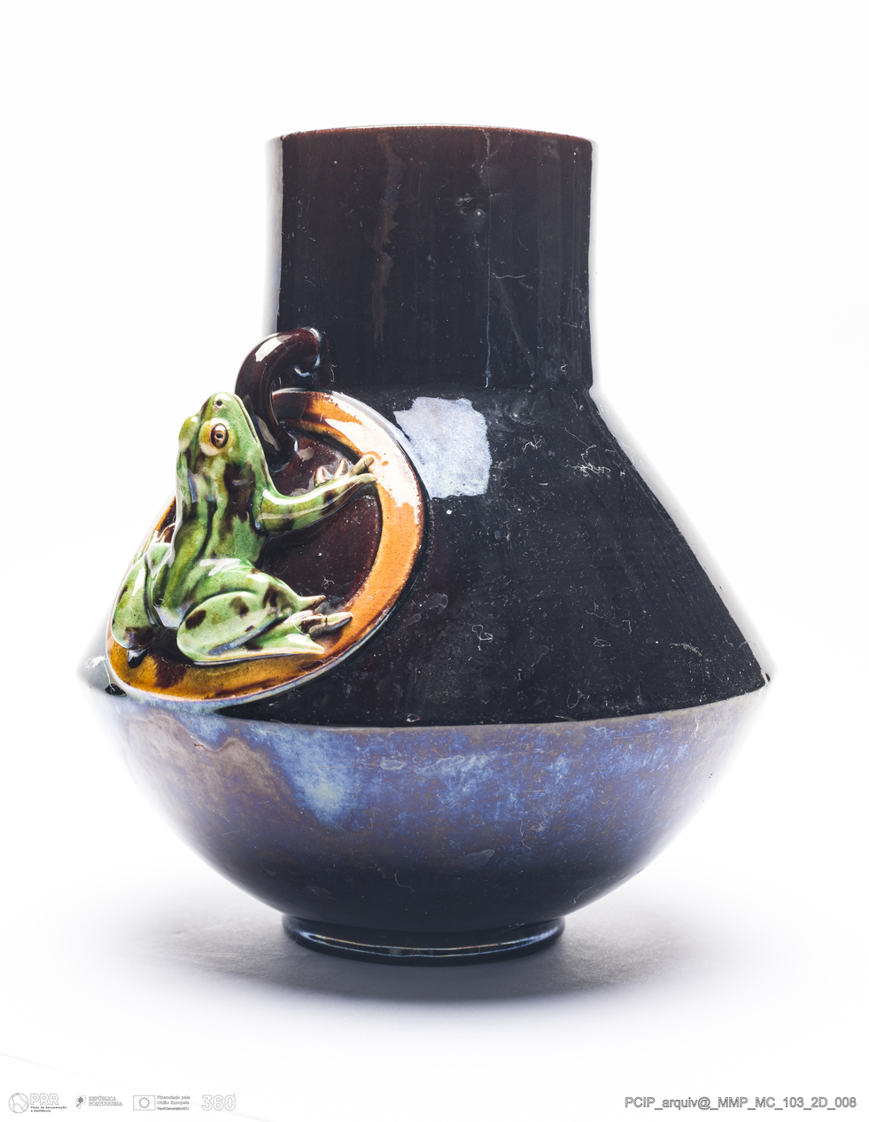 Matéria/Técnica: Barro vermelho moldado e modelado. Vidrado polícromo: metalizado, verde e castanho mel; Cronologia: 1906; Autoria: Manuel Gustavo Bordalo Pinheiro / Fábrica De Faianças das Caldas da Rainha, Portugal; Dimensões (cm): Altura: 21; Largura: 22.