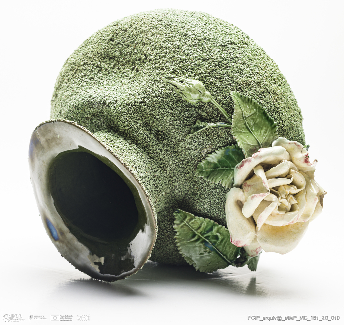 Matéria/Técnica: Barro vermelho moldado e modelado. Vidrado polícromo: verde, branco e amarelo. Musgados; Cronologia: 1900; Autoria: Rafael Bordalo Pinheiro / Fábrica De Faianças Bordalo Pinheiro, Caldas da Rainha, Portugal; Dimensões (cm): Altura: 18; Largura: 31; Comprimento: 20.