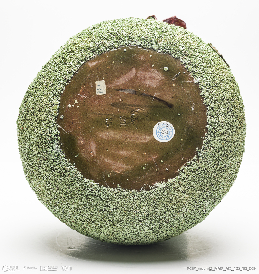 Matéria/Técnica: Barro vermelho moldado e modelado. Vidrado polícromo: vermelho e verde. Musgados; Cronologia: 1900; Autoria: Rafael Bordalo Pinheiro / Fábrica De Faianças Bordalo Pinheiro, Caldas da Rainha, Portugal; Dimensões (cm): Altura: 18; Largura: 31; Comprimento: 20.