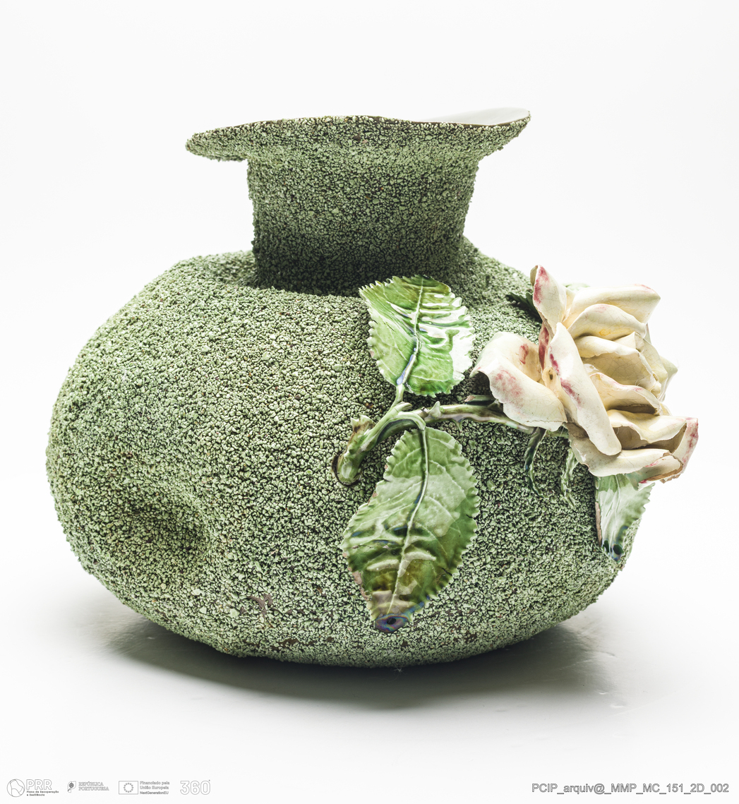 Matéria/Técnica: Barro vermelho moldado e modelado. Vidrado polícromo: verde, branco e amarelo. Musgados; Cronologia: 1900; Autoria: Rafael Bordalo Pinheiro / Fábrica De Faianças Bordalo Pinheiro, Caldas da Rainha, Portugal; Dimensões (cm): Altura: 18; Largura: 31; Comprimento: 20.