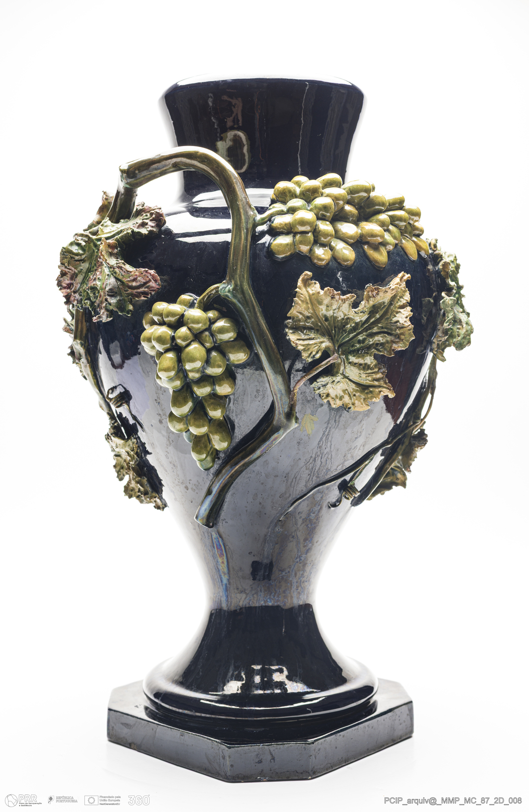 Matéria/Técnica: Barro branco modelado e moldado. Vidrado polícromo: castanho e verde; Cronologia: 1906; Autoria: Manuel Gustavo Bordalo Pinheiro / Fábrica de Faianças das Caldas da Rainha, Portugal; Dimensões (cm): Altura: 44,5; Largura: 31,5; Comprimento: 30.