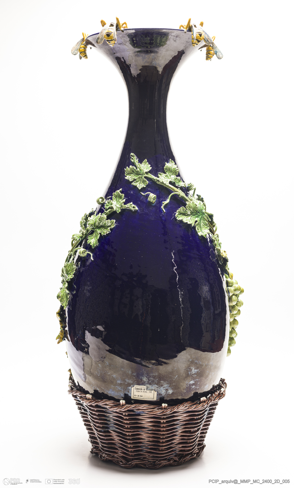 Matéria/Técnica: Barro vermelho rodado, moldado e modelado. Vidrado polícromo: azul cobalto, castanho manganês, branco, vermelho, amarelo, verde e preto; Cronologia: 1908; Autoria: Manuel Ghustavo Bordalo Pinheiro / Fábrica Bordalo Pinheiro, Caldas da Rainha; Dimensões (cm): Altura: 70; Diâmetro: 32.