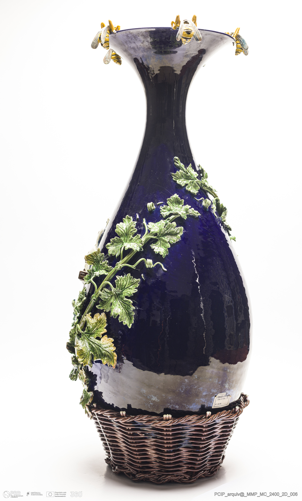 Matéria/Técnica: Barro vermelho rodado, moldado e modelado. Vidrado polícromo: azul cobalto, castanho manganês, branco, vermelho, amarelo, verde e preto; Cronologia: 1908; Autoria: Manuel Ghustavo Bordalo Pinheiro / Fábrica Bordalo Pinheiro, Caldas da Rainha; Dimensões (cm): Altura: 70; Diâmetro: 32.