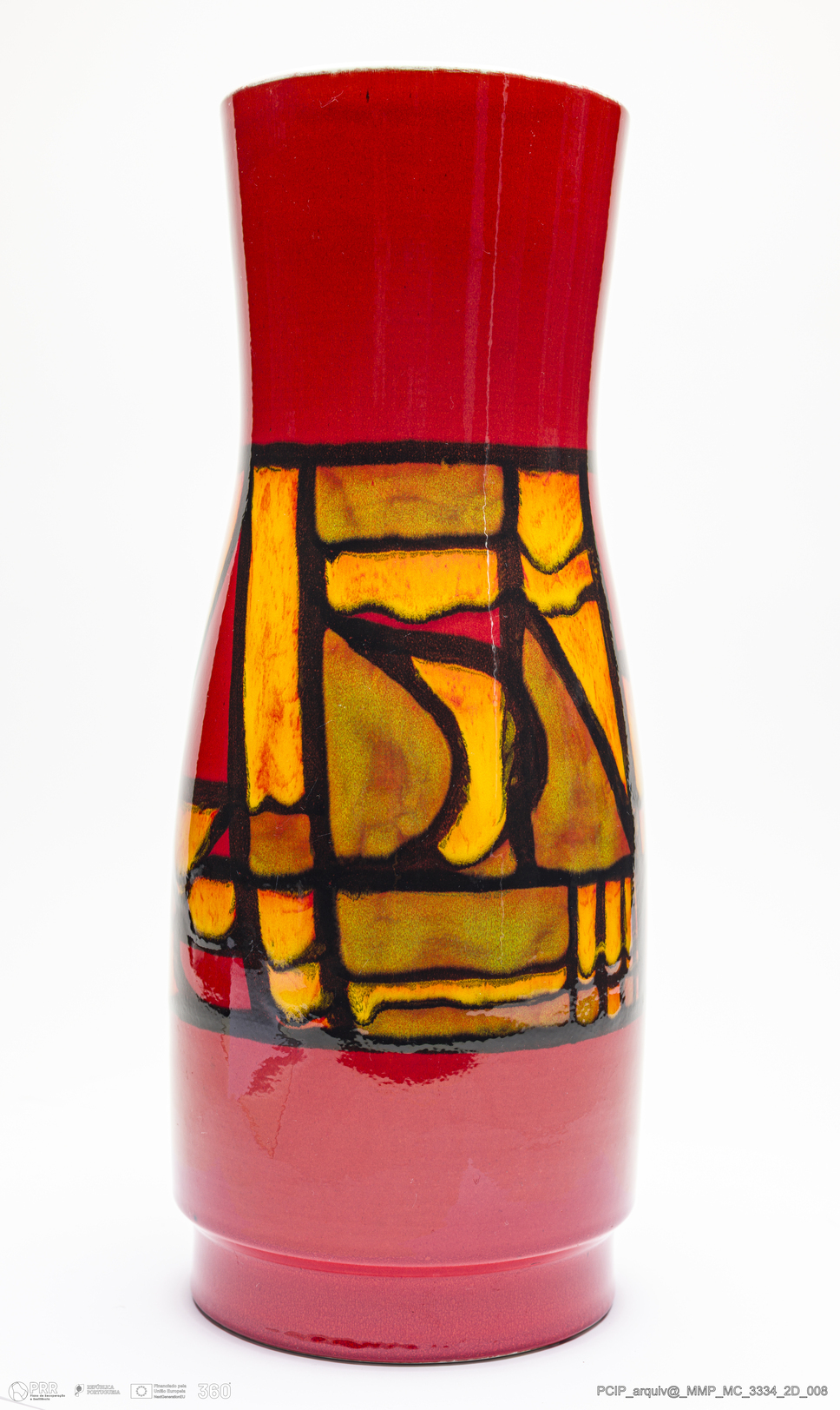 Matéria/Técnica: Barro branco rodado. Vidrado polícromo: preto, vermelho, laranja, amarelo, verde e branco; Cronologia: 1966-1980; Autoria: Tony Morris / Fábrica Poole, Inglaterra; Dimensões (cm): Altura: 39; Diâmetro: 15,5.