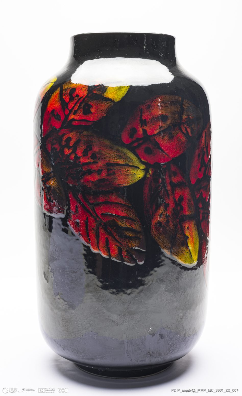 Matéria/Técnica: Faiança rodada. Vidrado polícromo: preto, castanho, vermelho, verde e amarelo; Cronologia: 1950-1960; Autoria: Raymor Bitossi / Itália; Dimensões (cm): Altura: 33,2; Diâmetro: 18,7.