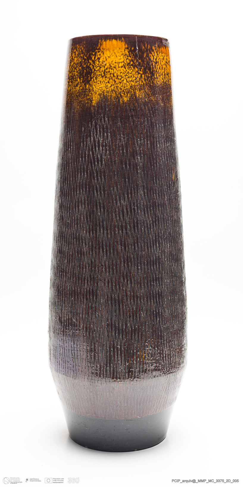 Matéria/Técnica: Grés com riscados rodado. Vidrado polícromo: preto, azul, castanho e amarelo; Cronologia: Século XX; Autoria: Desconhecido / Suécia; Dimensões (cm): Altura: 55; Diâmetro: 20.