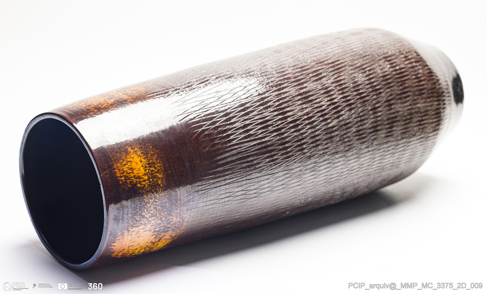 Matéria/Técnica: Grés com riscados rodado. Vidrado polícromo: preto, azul, castanho e amarelo; Cronologia: Século XX; Autoria: Desconhecido / Suécia; Dimensões (cm): Altura: 55; Diâmetro: 20.