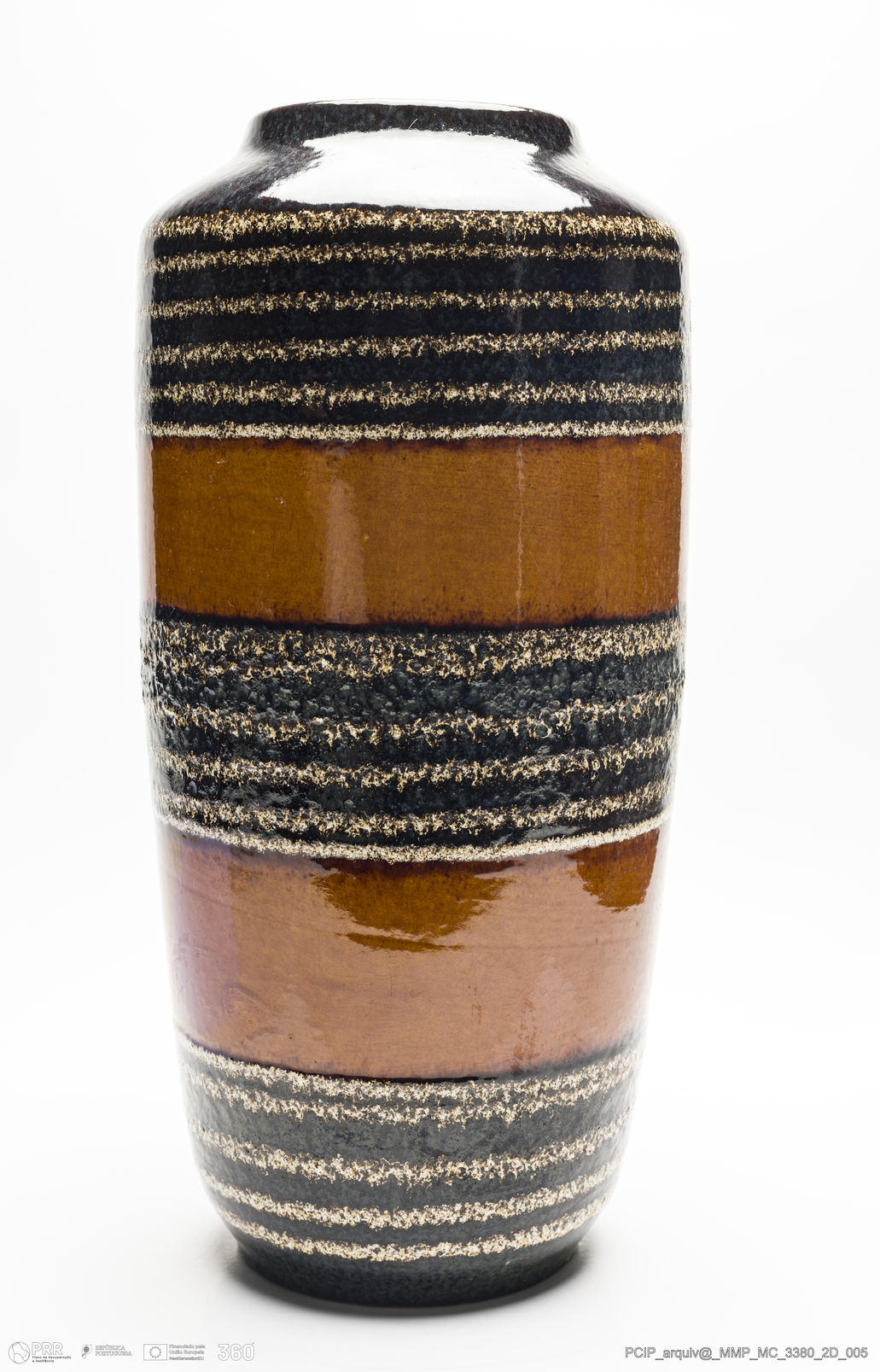 Matéria/Técnica: Barro branco moldado. Vidrado polícromo: preto, castanho e branco; Cronologia: 1960-1970; Autoria: Desconhecido / Scheurich, Alemanha; Dimensões (cm): Altura: 44,5; Diâmetro: 21,7.