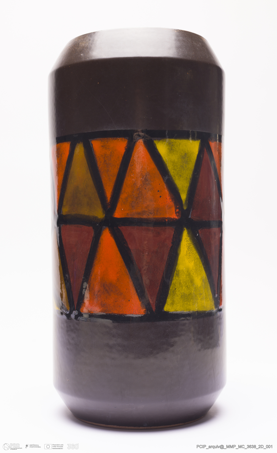 Matéria/Técnica: Barro vermelho rodado. Vidrado polícromo: preto, vermelho, laranja, amarelo, castanho e branco; Cronologia: 1950-1960; Autoria: Raymor Bitossi / Itália; Dimensões (cm): Altura: 32,5; Diâmetro: 16.