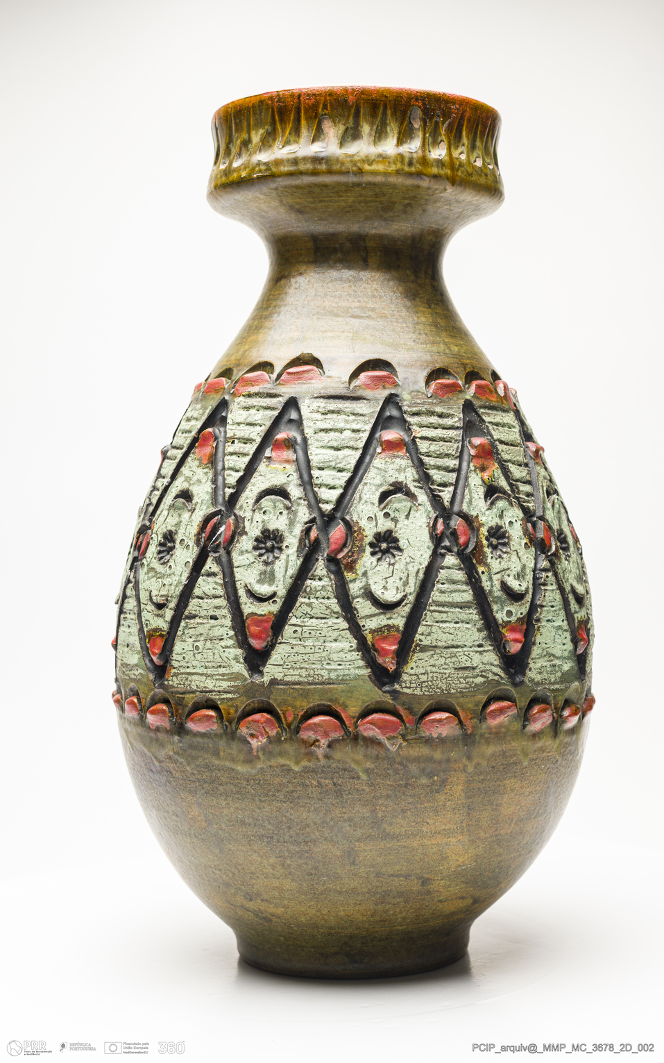 Matéria/Técnica: Barro vermelho rodado. Vidrado polícromo mate: vermelho, castanho, verde seco e verde água; Cronologia: século XX; Autoria: Desconhecido / Itália; Dimensões (cm): Altura: 44; Diâmetro:25.