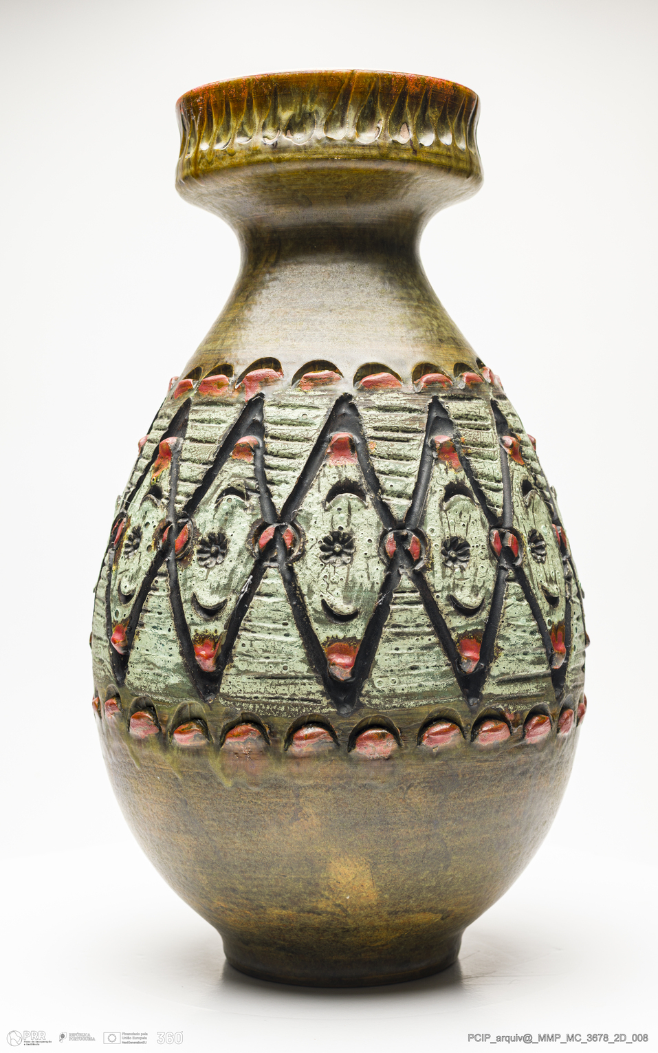 Matéria/Técnica: Barro vermelho rodado. Vidrado polícromo mate: vermelho, castanho, verde seco e verde água; Cronologia: século XX; Autoria: Desconhecido / Itália; Dimensões (cm): Altura: 44; Diâmetro:25.