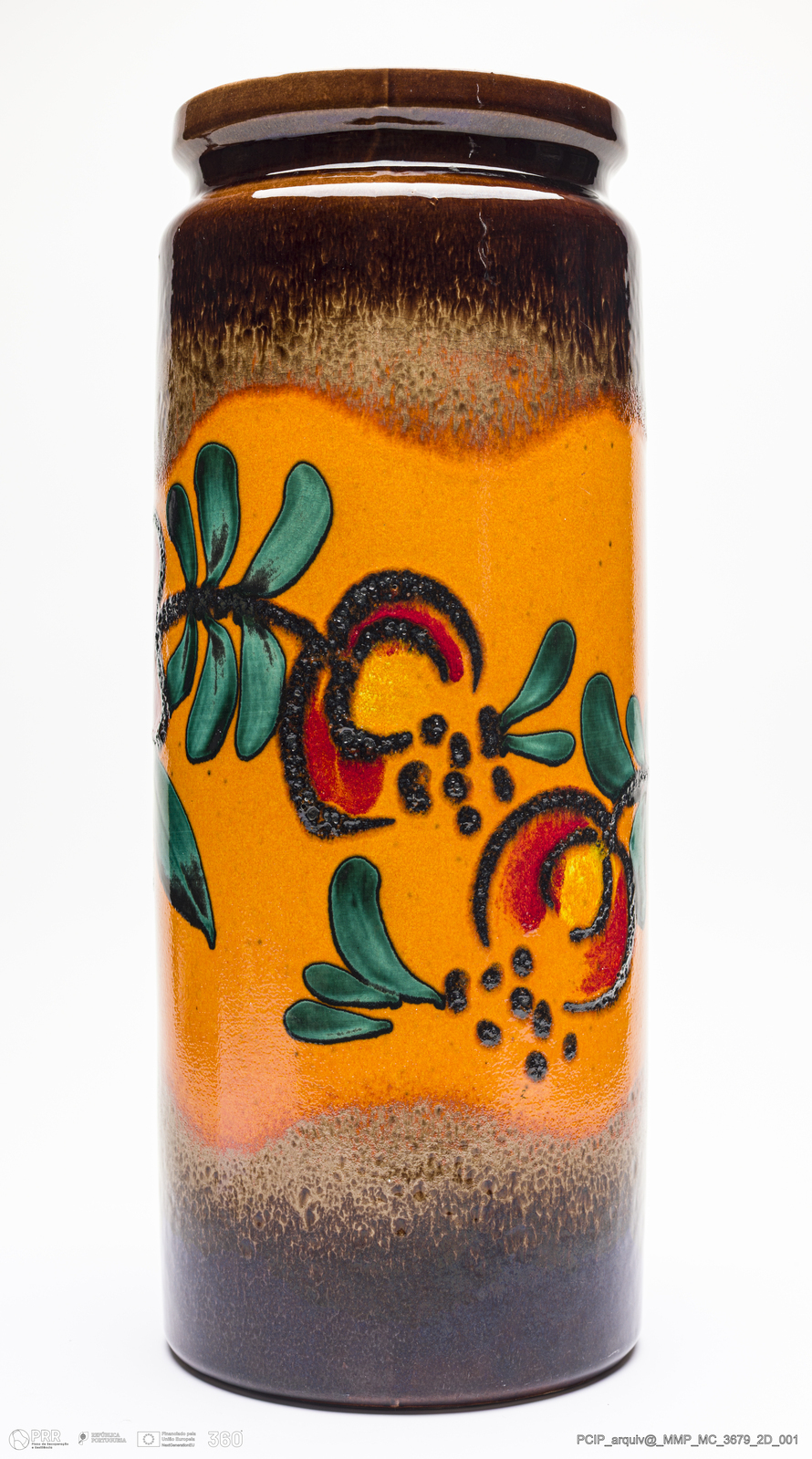 Matéria/Técnica: Barro branco rodado. Vidrado polícromo: castanho escuro e mel, verde, vermelho e preto; Cronologia: 1960-1970; Autoria: Desconhecido / Scheurich, Alemanha; Dimensões (cm): Altura: 45; Diâmetro:16.