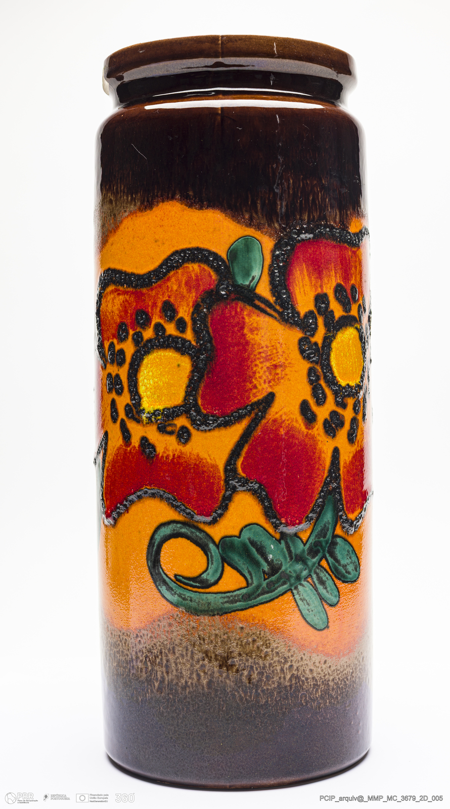 Matéria/Técnica: Barro branco rodado. Vidrado polícromo: castanho escuro e mel, verde, vermelho e preto; Cronologia: 1960-1970; Autoria: Desconhecido / Scheurich, Alemanha; Dimensões (cm): Altura: 45; Diâmetro:16.