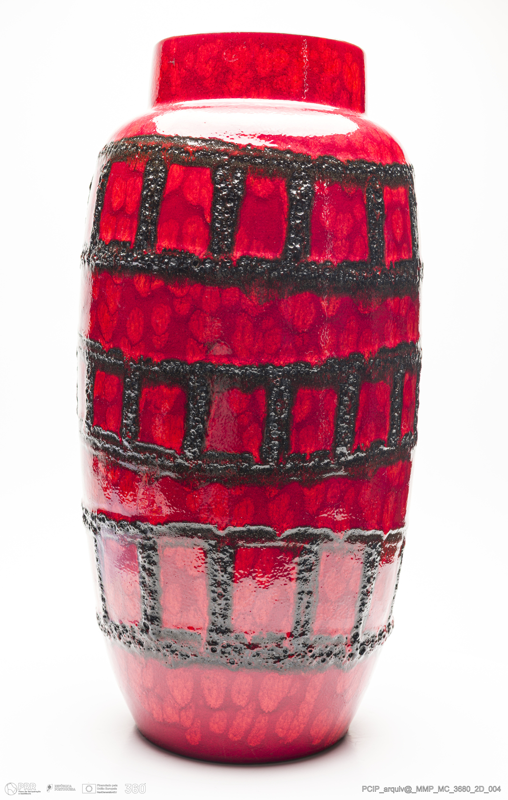 Matéria/Técnica: Barro branco rodado. Vidrado polícromo: preto e vermelho; Cronologia: 1960-1970; Autoria: Desconhecido / Scheurich, Alemanha; Dimensões (cm): Altura: 51,5; Diâmetro:23.