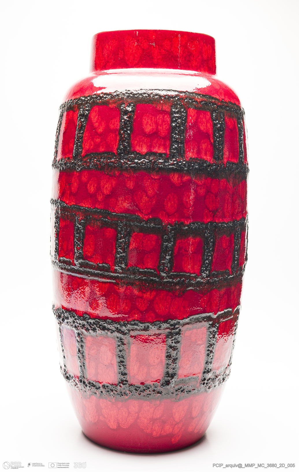 Matéria/Técnica: Barro branco rodado. Vidrado polícromo: preto e vermelho; Cronologia: 1960-1970; Autoria: Desconhecido / Scheurich, Alemanha; Dimensões (cm): Altura: 51,5; Diâmetro:23.