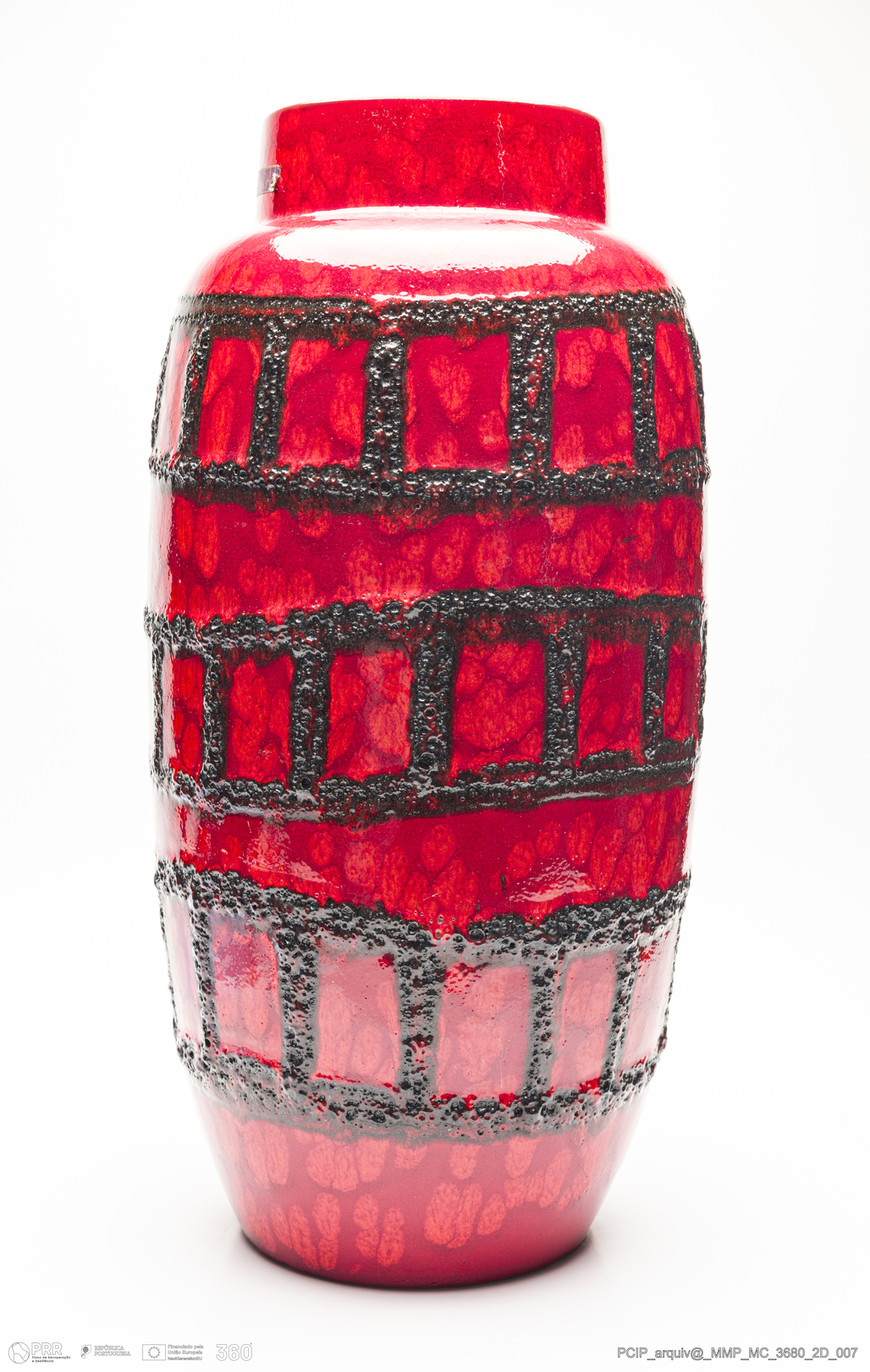 Matéria/Técnica: Barro branco rodado. Vidrado polícromo: preto e vermelho; Cronologia: 1960-1970; Autoria: Desconhecido / Scheurich, Alemanha; Dimensões (cm): Altura: 51,5; Diâmetro:23.