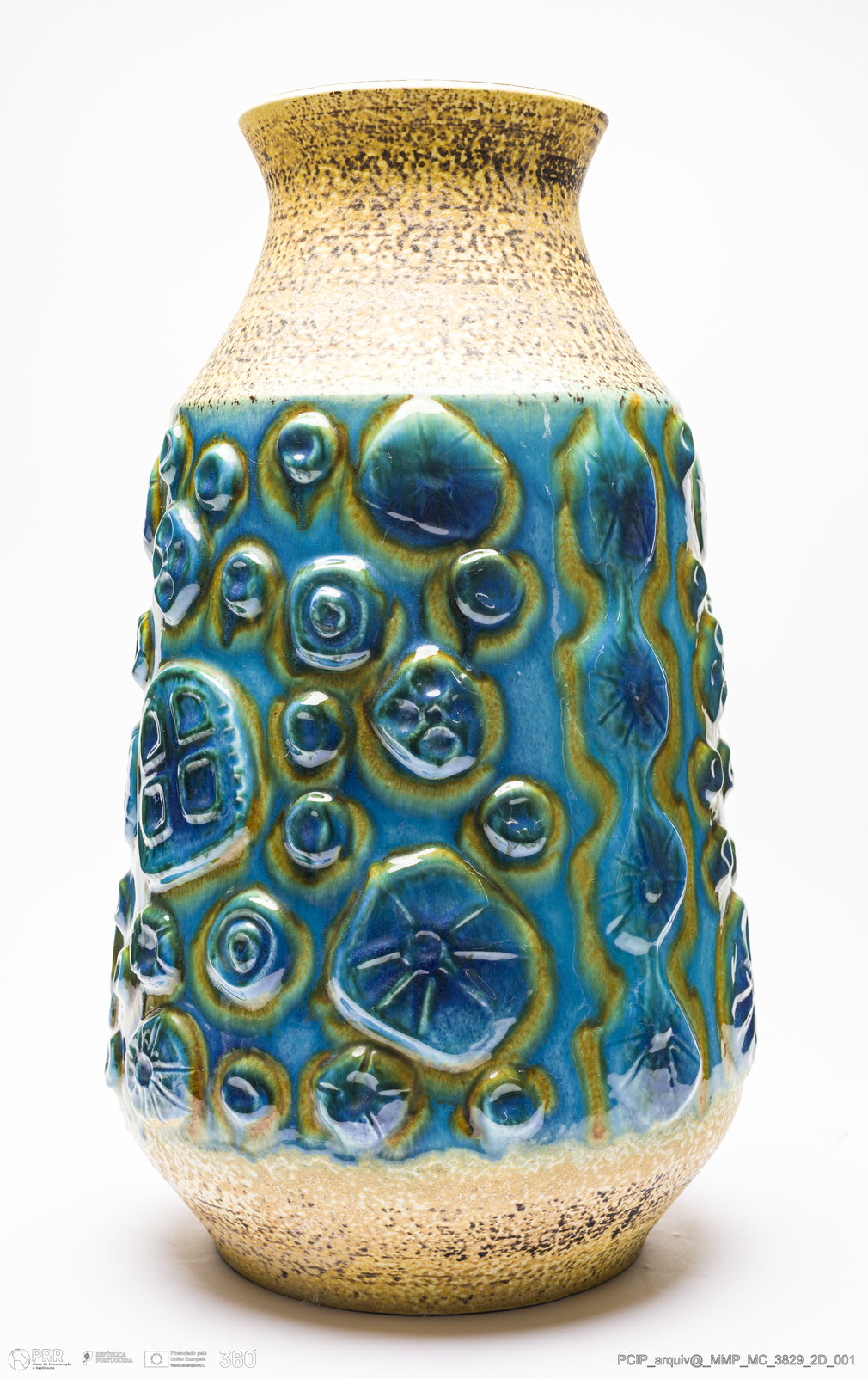 Matéria/Técnica: Barro vermelho moldado. Vidrado polícromo: castanho escuro e mel, azul, verde e camurça; Cronologia: 1945-1984; Autoria: Desconhecido / Carstens / Alemanha; Dimensões (cm): Altura: 50,5; Diâmetro:27.