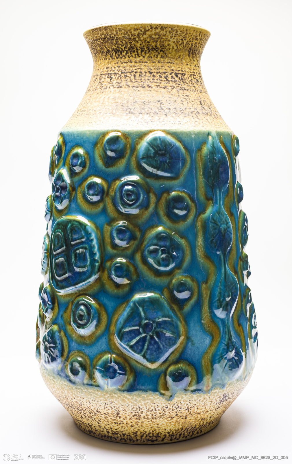 Matéria/Técnica: Barro vermelho moldado. Vidrado polícromo: castanho escuro e mel, azul, verde e camurça; Cronologia: 1945-1984; Autoria: Desconhecido / Carstens / Alemanha; Dimensões (cm): Altura: 50,5; Diâmetro:27.
