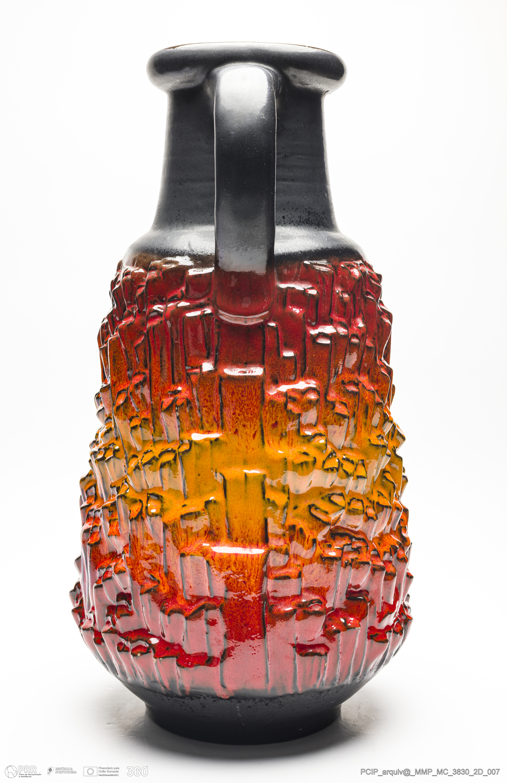 Matéria/Técnica: Barro vermelho rodado. Vidrado polícromo: castanho, vermelho e laranja; Cronologia: 1945-1984; Autoria: Desconhecido / Carstens / Alemanha; Dimensões (cm): Altura: 46; Largura: 22,5; Com 23,5.