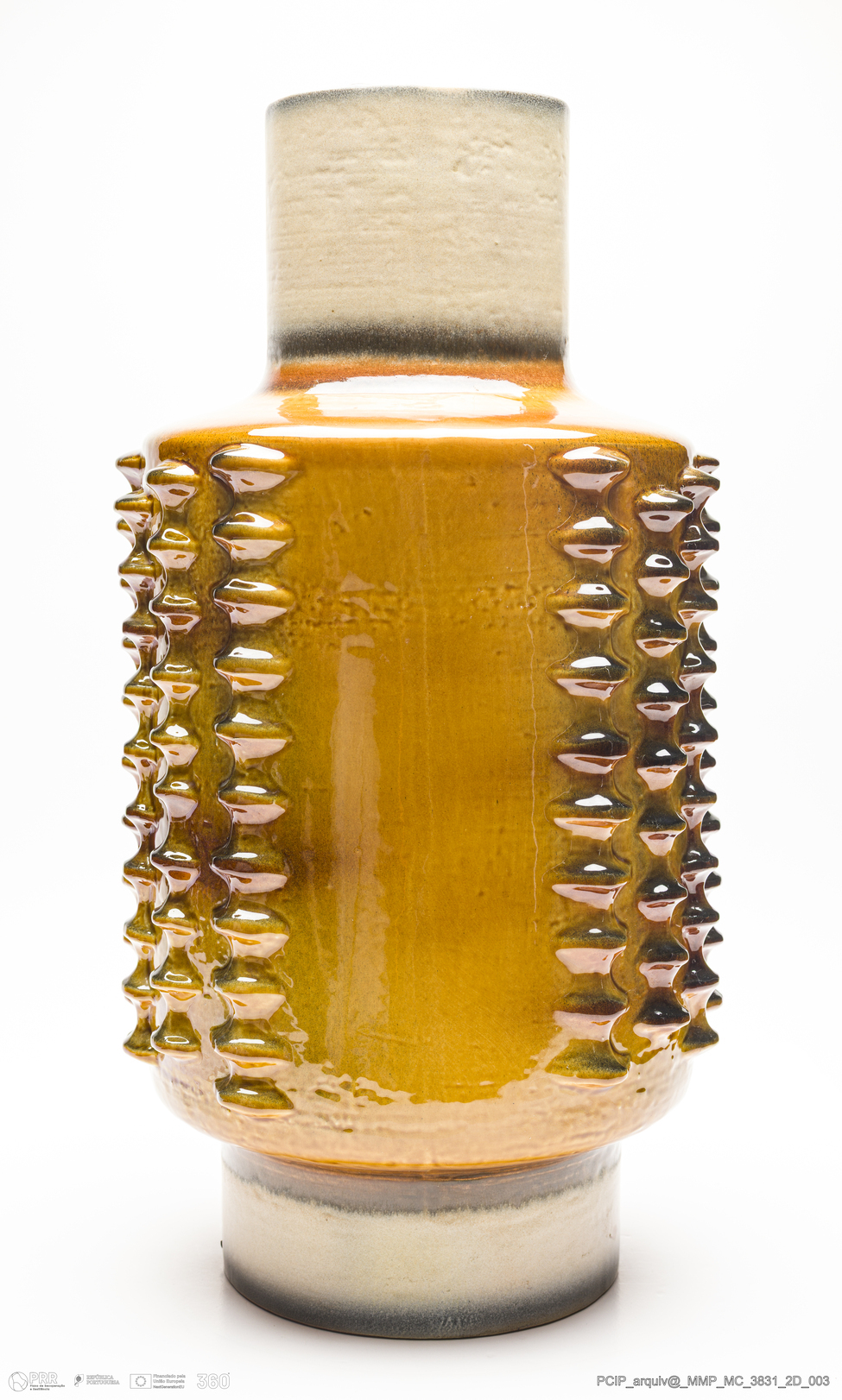 Matéria/Técnica: Barro vermelho rodado. Vidrado polícromo: castanho escuro e mel, preto e camurça; Cronologia: 1945-1984; Autoria: Desconhecido / Carstens / Alemanha; Dimensões (cm): Altura: 50,5; Comprimento: 24,5.