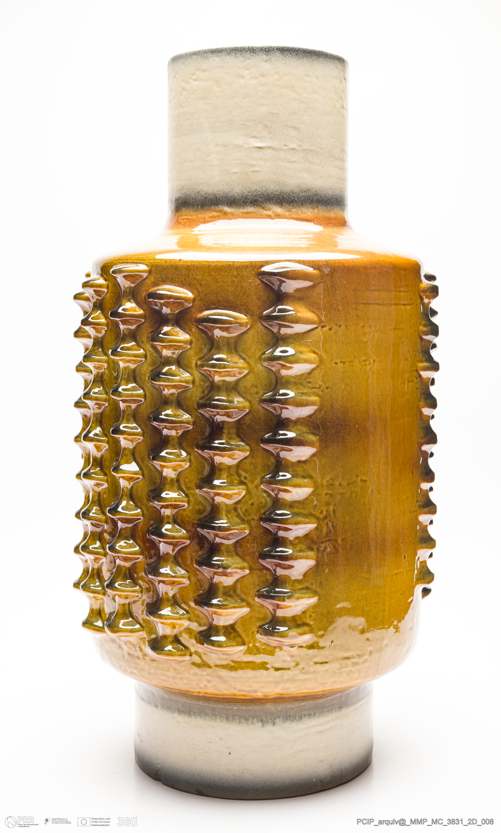 Matéria/Técnica: Barro vermelho rodado. Vidrado polícromo: castanho escuro e mel, preto e camurça; Cronologia: 1945-1984; Autoria: Desconhecido / Carstens / Alemanha; Dimensões (cm): Altura: 50,5; Comprimento: 24,5.